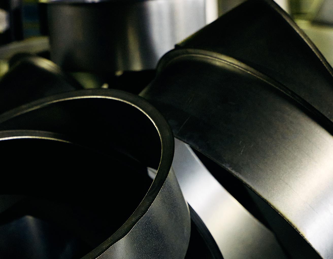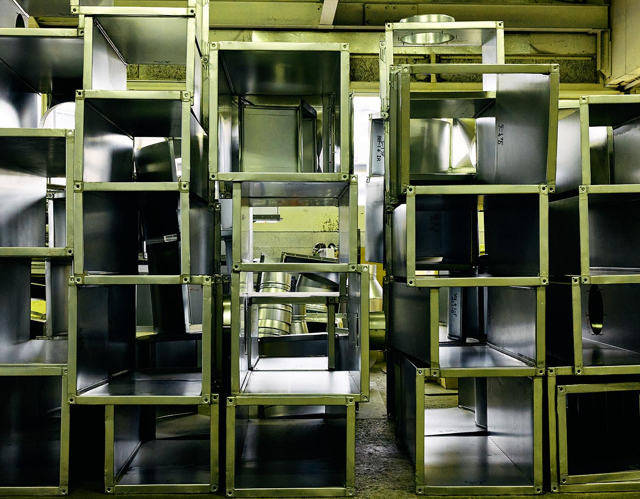 まがったダクト。角度は90度が標準であるが、任意の度数まで何度でも製作は可能。カーブしながら変形したり、ねじれを加えたりもできるが、断面積が少なくなると抵抗が増す。